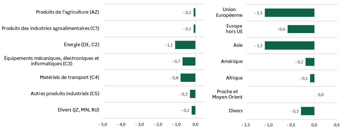La dégradation est notable pour les produits énergétiques (- 1,1 Md€) ainsi que pour les matériels de transport (- 0,8 Md€).