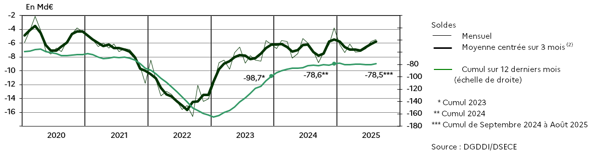 En août 2025*, le solde commercial de la France s’améliore (+ 0,3 milliard d’euros) pour s’établir à - 5,8 milliards d’euros.