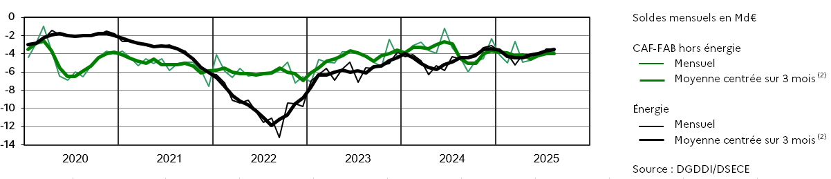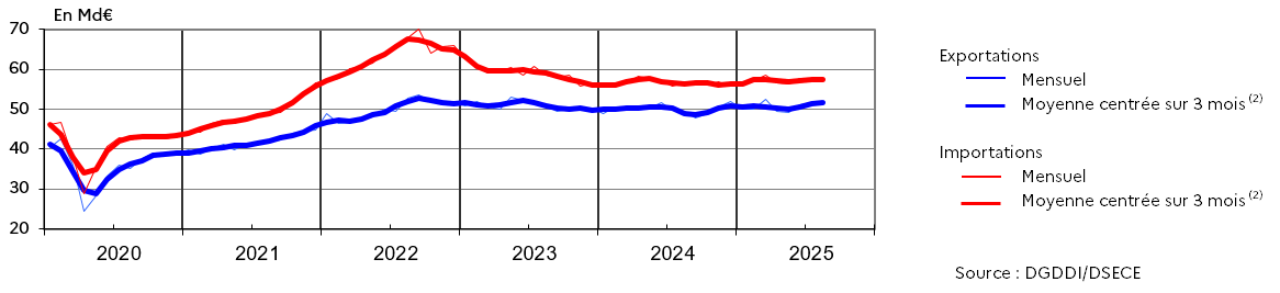 (3)  Échanges CAF/FAB en Md€ corrigés des variations saisonnières et des effets des jours ouvrables (CVS-CJO). Ils comprennent le matériel militaire (MATMIL) et l'estimation des transactions sous le seuil (SLS)