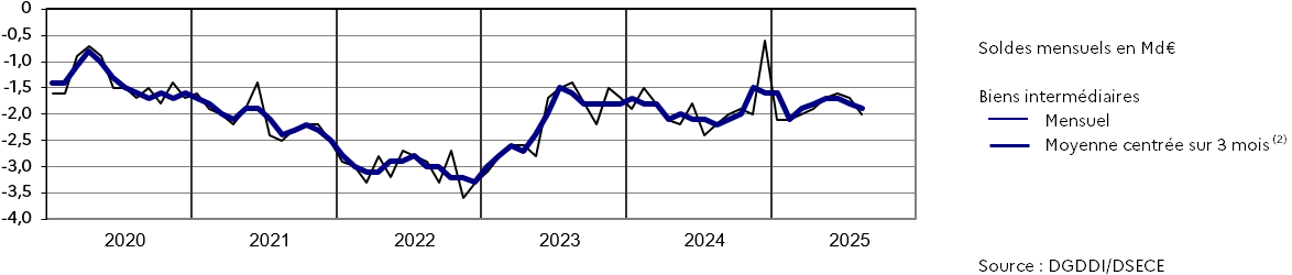 En août 2025, le solde des biens intermédiaires diminue légèrement (- 0,1 Md€) et atteint - 1,9 Md€. Les exportations diminuent (- 0,1 Md€) et les importations sont stables.