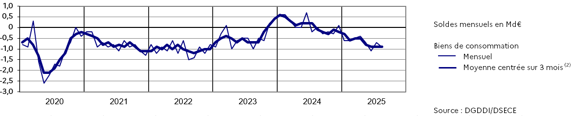 En août 2025, le solde des biens de consommation reste stable à - 0,9 Md€, les exportations et les importations n’ayant pas enregistré d’évolution au cours de ce mois.